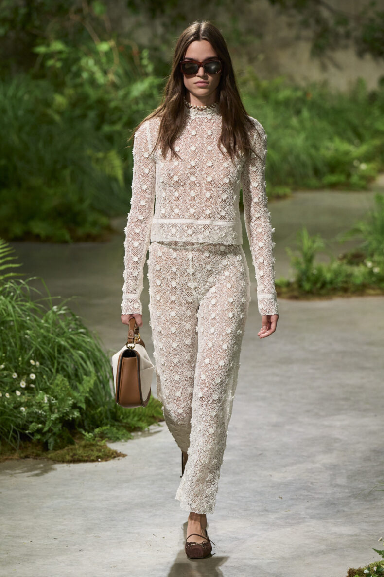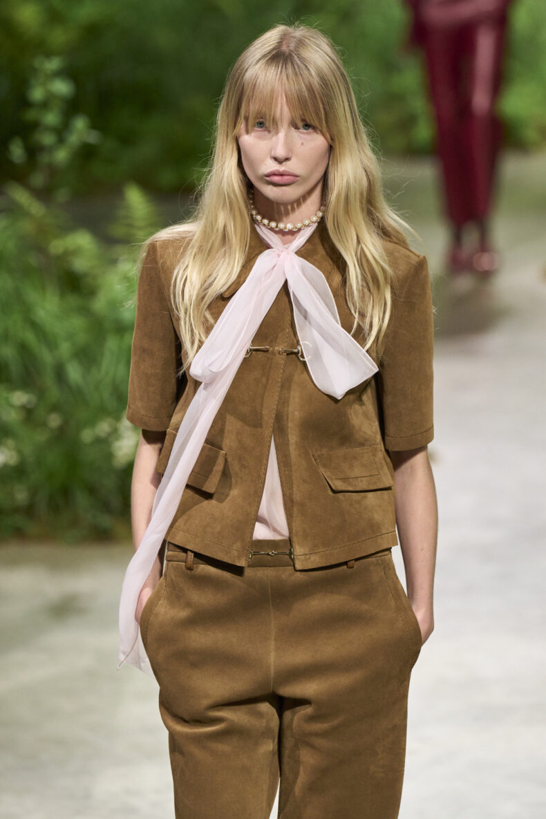 The collection boldly explored human contradictions, turning fragility into strength and celebrating individuality. Gucci’s iconic symbols and British style literally merged into an unrepeatable imaginary, while craftsmanship and fashion created a universal language capable of overcoming cultural barriers. The color palette is extremely wide, ranging from the famous Red Ancora to various earth-tone shades, with touches of aqua green, white, black, lilac, and pink. Among bows, long flowing dresses, and accessories destined to enrich many wardrobes, a new and irresistible world emerges.