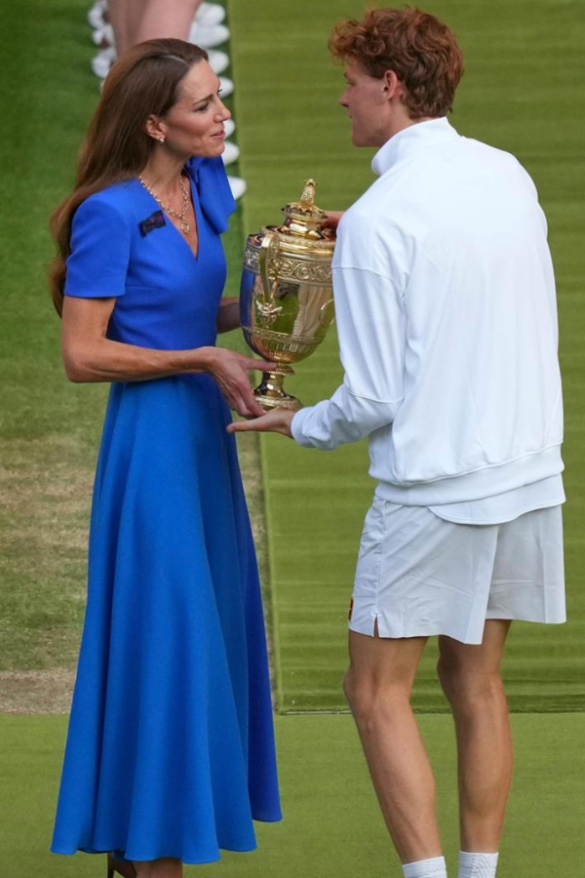 Durante la premiazione di Jannik Sinner, dopo una finale storica che ha consegnato all’Italia il primo trionfo maschile a Wimbledon, un grido ha sorpreso la folla: “I love you Kate!”. Lei, sorridente e composta come sempre, ha applaudito il campione italiano mentre la sua presenza – elegante, regale e discreta – rubava quasi la scena. Un gesto che ha detto tutto: la Principessa del Galles, anche da spettatrice, è ormai parte dell’anima del torneo.