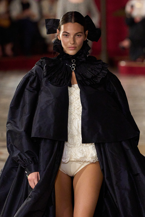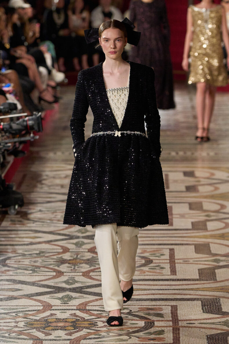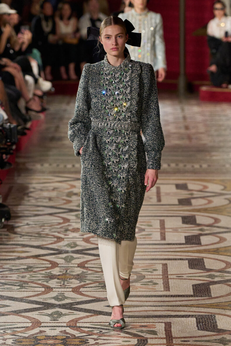 La collezione è stata una vera e propria sinfonia di materiali opulenti tra cui piume, nappe, cabochon e fiori ricamati, tessuti preziosi come il tweed, il velluto e la seta, creazioni che hanno reinterpretato i codici iconici della Maison Chanel con un touch decisamente romantico. Dai tailleur rivisitati ai completi da sera e i cappotti lunghi, l’abbigliamento ha evocato una moderna tradizione teatrale.