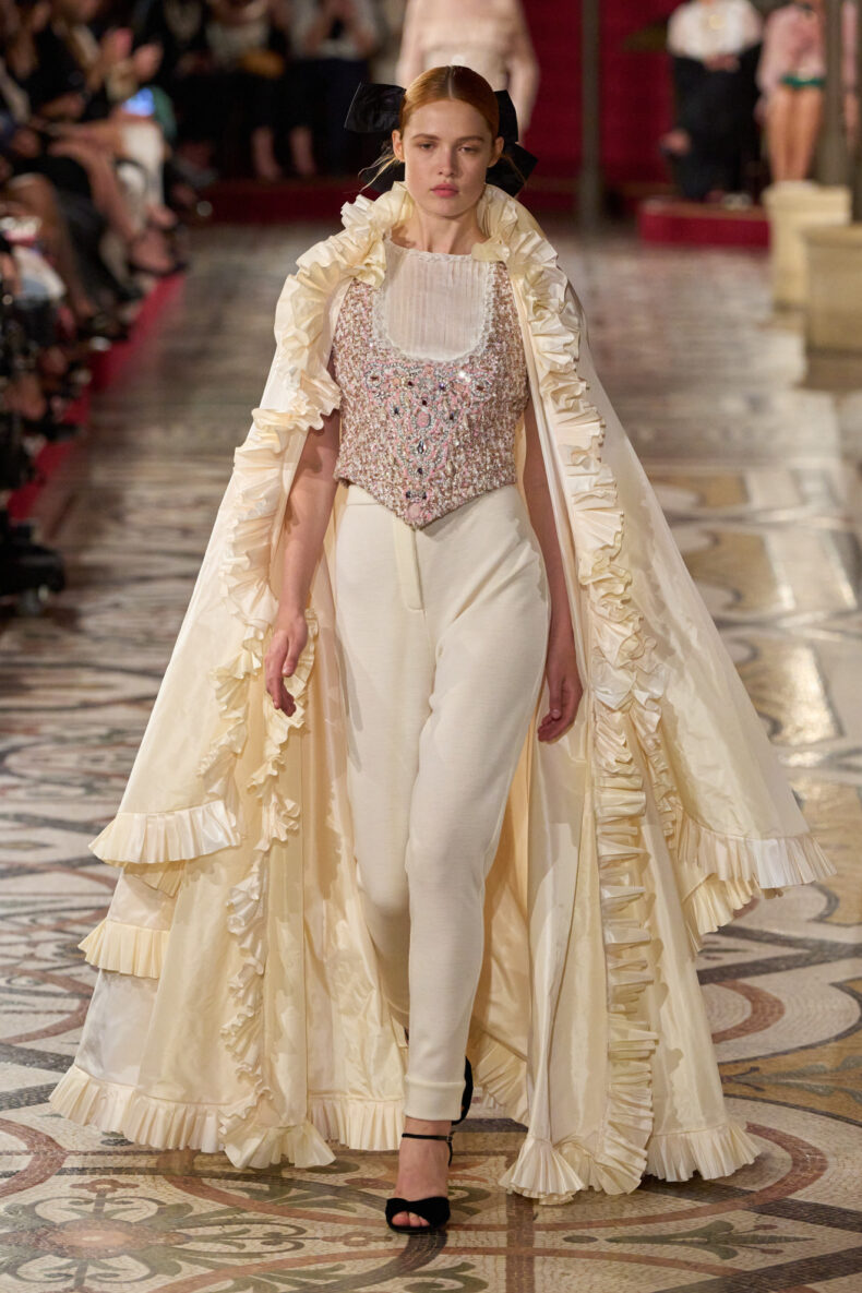 La palette cromatica, invece, ha spaziato dal nero all’oro, passando per l’argento e il fucsia, richiamando l’atmosfera delle soirée più incantevoli. In questo scenario, la storica casa di moda francese ha continuato a celebrare la sua profonda connessione con l’Opéra National de Paris, di cui è stata grande sostenitrice nel corso degli anni.
