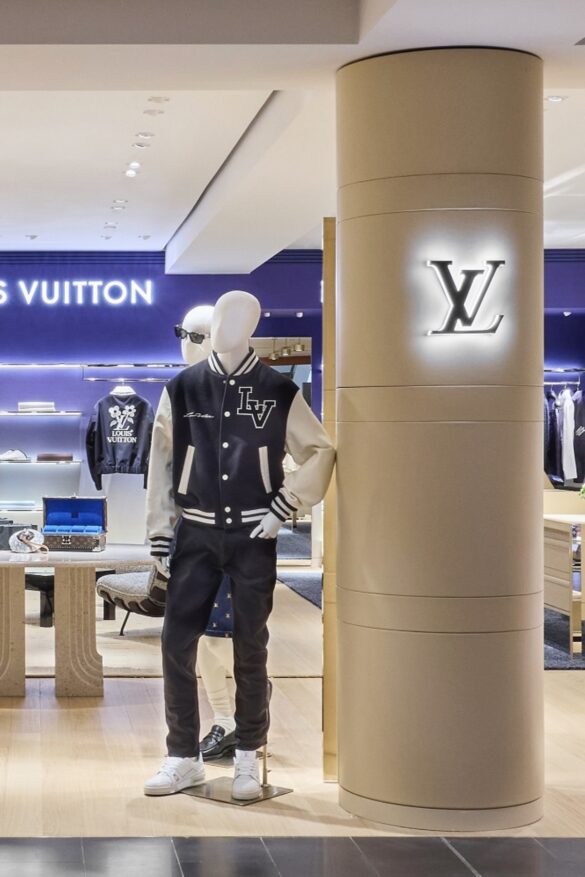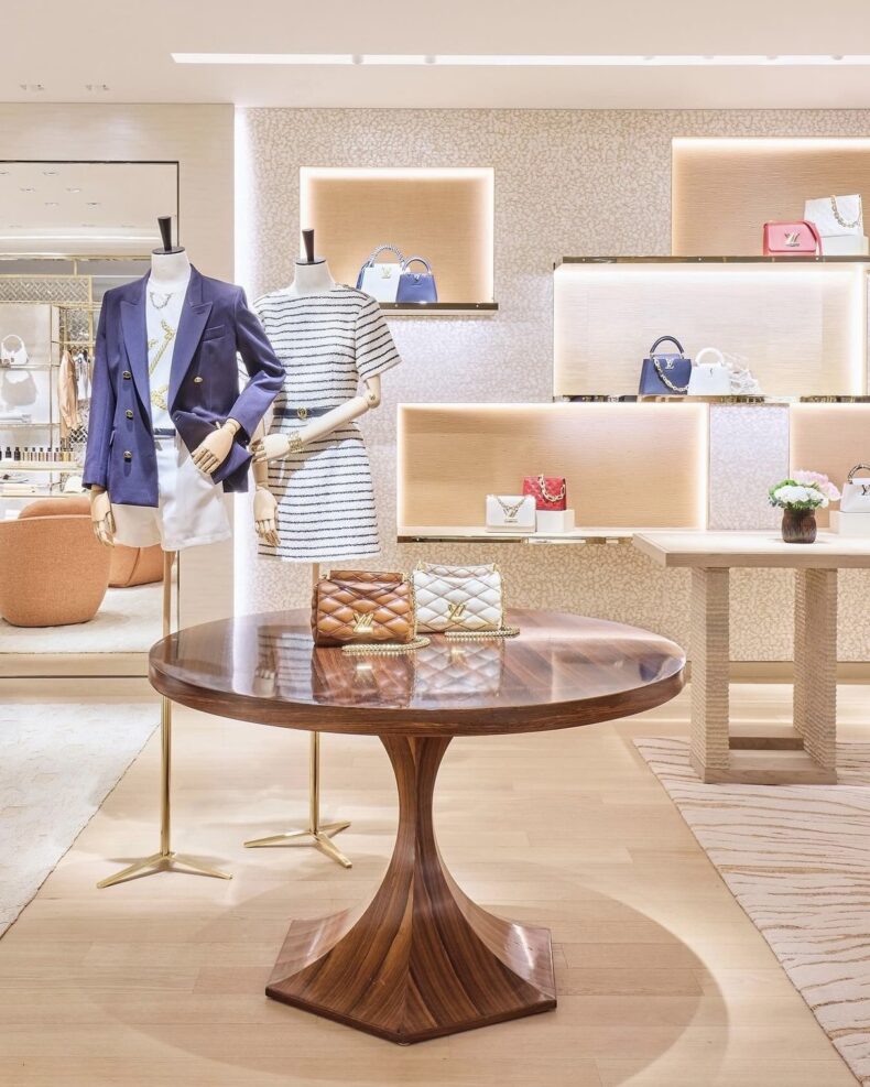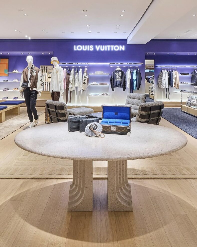 Il negozio dedicato all’uomo, situato al primo piano, accoglie i visitatori con nuances di colore neutre dall’atmosfera informale ma pur sempre così cool. Dal blu intenso al bianco, passando per l’iconico pattern Monogram. La selection di prodotti va dall’abbigliamento alle fragranze e, tra i mobili di design, spicca il tavolo Samo in marmo bianco di Carlo Scarpa – emblema di eleganza e raffinatezza italiana.