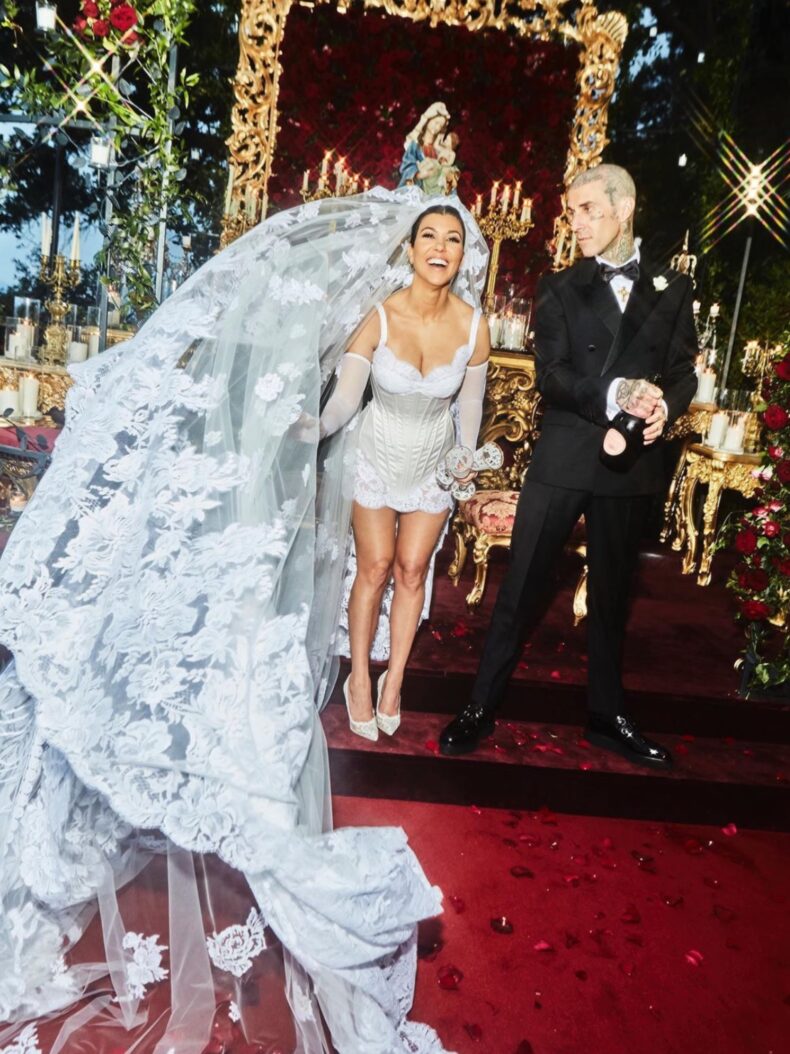Il matrimonio di Kourtney Kardashian e Travis Barker, celebrato sfarzosamente nel pittoresco scenario di Portofino, in Italia, nel luglio del 2022, è stato un vero e proprio spettacolo. Kourtney e Travis, in quella occasione, hanno scelto di indossare abiti firmati Dolce & Gabbana. Entrambi sfoggiavano abiti dall’allure tradizionale con un tocco di modernità. Inoltre, la scelta di affidarsi a uno tra brand di moda più prestigiosi e rappresentativi del panorama italiano non è stata di certo casuale.