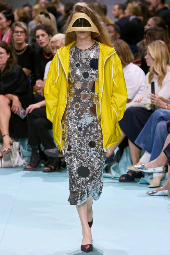 L’impermeabile smette di essere un capo puramente funzionale e si fa protagonista. I trench vengono ripensati con tagli oversize, tessuti tecnici e dettagli inediti. Miu Miu ha portato in passerella versioni minimal, asciutte e monocromatiche, ideali per uno stile urbano e moderno. Louis Vuitton ha invece giocato con materiali trasparenti e silhouette architettoniche, trasformando la giacca da pioggia in un capo d’alta moda. Anche Prada e Boss hanno dato spazio a parka sportivi, accostati però a capi più femminili come gonne leggere o abiti in seta, dimostrando che il contrasto funziona.