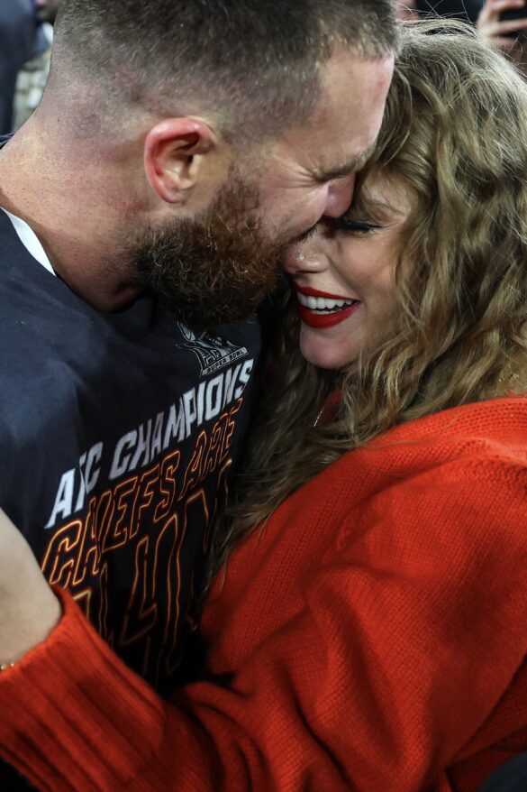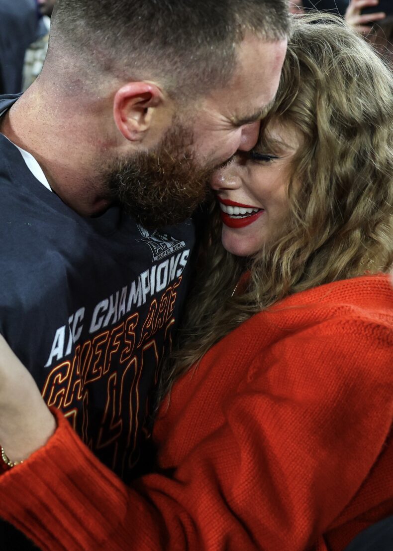 - BALTIMORE, MARYLAND – JANUARY 28: Travis Kelce #87 of the Kansas City Chiefs (L) celebrates with Taylor Swift after defeating the Baltimore Ravens in the AFC Championship Game at M&T Bank Stadium on January 28, 2024 in Baltimore, Maryland. (Photo by Patrick Smith/Getty Images)