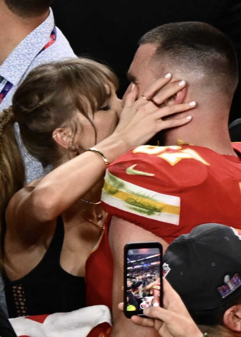 - US singer-songwriter Taylor Swift kisses Kansas City Chiefs’ tight end #87 Travis Kelce after the Chiefs won Super Bowl LVIII against the San Francisco 49ers at Allegiant Stadium in Las Vegas, Nevada, February 11, 2024. (Photo by Patrick T. Fallon / AFP)
