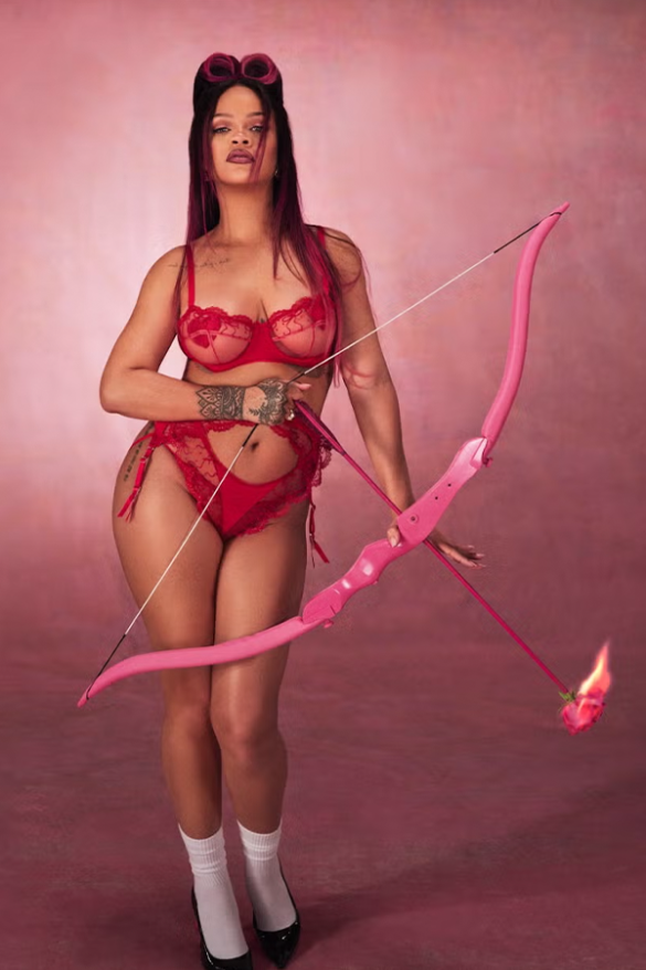 Per dare vita alla nuova collezione, Rihanna si reinventa come un Cupido moderno e audace in un servizio fotografico che ha già scatenato il web. Con un completo rosso scarlatto composto da un reggiseno a balconcino in raso, slip brasiliano in pizzo e una sensualissima cintura porta-giarrettiere, Rihanna sfoggia un look che mescola ironia e seduzione. A completare l’immagine, copricapezzoli a forma di cuore, un arco rosa e un drappo di rose che avvolge il suo corpo. Accanto a lei, alcune star emergenti come Serena Page, Kordell Beckham e i fratelli Hayley e Jules LeBlanc, rappresentano appieno la filosofia inclusiva di Savage X Fenty, confermando che non esiste un solo modo di essere belli o di amare.
